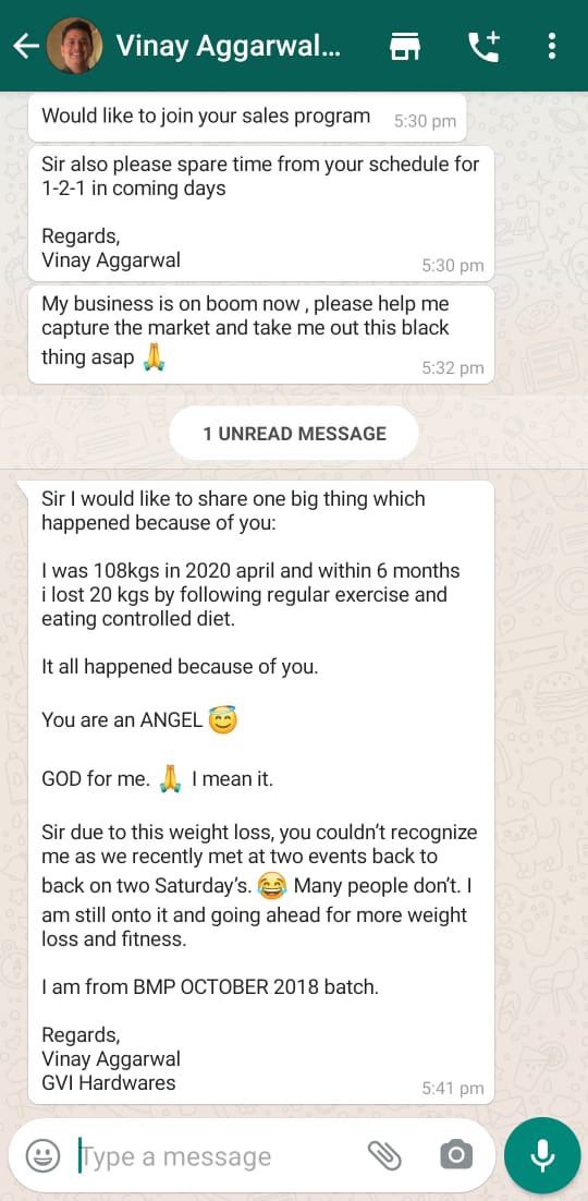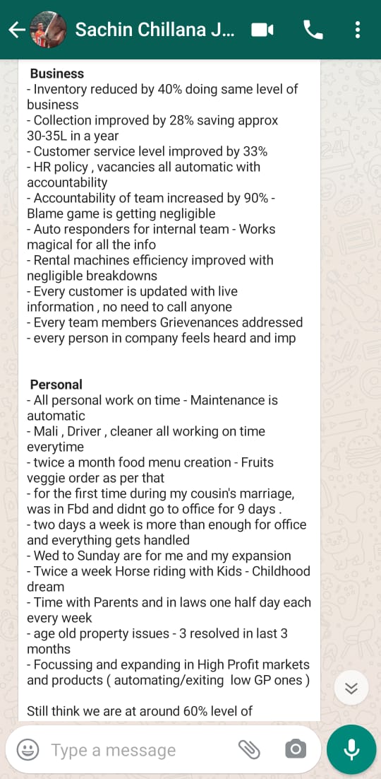 I have completed the Business Mastery Program in the year 2013. I am currently going to the office only for 2 days a week that too for weekly reviews only with my teams. I also started a new business in the manufacturing and exports domain in 2016 thanks to more time on hand. I could set up my new business based on the science applied in my existing business, although they belong to different verticals/domains. We could clearly define KRA’s and KPI’s for each employee and thus increase their productivity. Optimum productivity helped us to diminish the culture of having Senior Departmental Heads which in turn resulted in a 40% cutdown in Manpower Cost. Our inventory and operations cost is also slashed down. Let’s not forget to mention that profits have increased by 60% – 70%, we have reduced our dispatch time to 48 hours from 5-6 days, lead time brought down to 15 days from 90 days and in a span of 1.5 years only we have increased our distributors count  to 15 from 3. Interestingly there was no slowdown in my business even when others were facing slowdown. Even after doing all this I can proudly say that, I take 4 vacations a year.