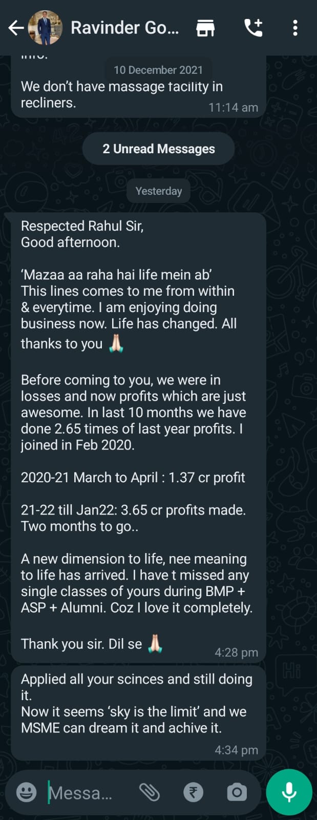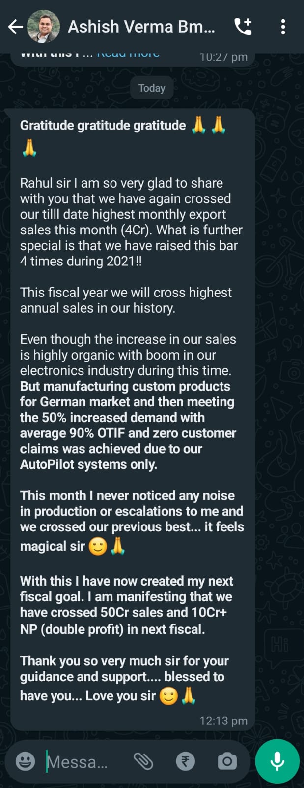 I have completed the Business Mastery Program in the year 2015. Post the workshop I started working only one day a week in the office. I personally streamlined all the processes and created a system and while doing so I was constantly interacting with my clients and identified their pain points. I was creating value addition to what my clients wanted. Earlier my QC staff travelling cost to client premises was 17 lacs yearly and we could slash it down to 1.38 lacs yearly. We also identified and realigned certain designation, this helped to rehire staff at much lower salary thus slashing our Manpower Cost. Our turnover increased to 110 crores from 40 crores in a span of 2.5 years and as spiral effect turnover of the second plant/setup increased to 45 crores from 18 crores. We also increased our On time Delivery to 82% from 38%,on time payment receipt spiked to 77% from 33% and not to forget that our quality based rejection dropped to 0.7% from 2.5%
