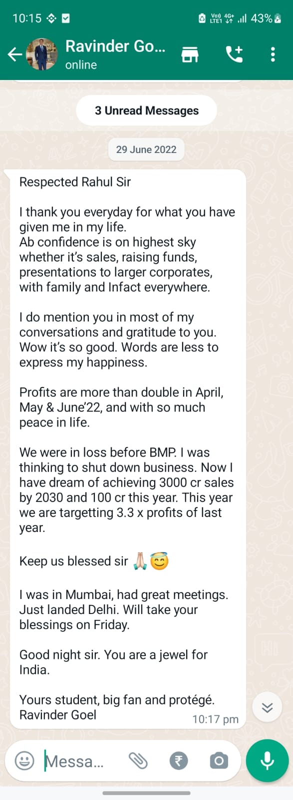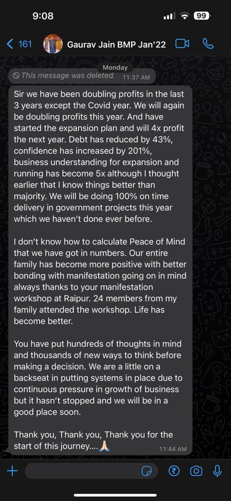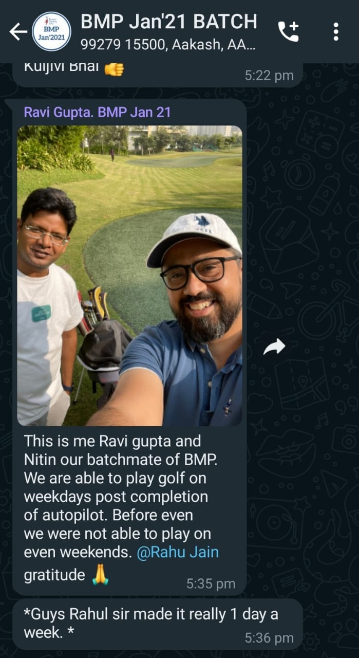 I completed the Business Mastery Program in the year 2015. I wanted to retire operationally from business and now I only need to go to the office for 1.5 days weekly, rest of my time is invested on client meetings, sales pitches, attending conferences/ seminars. This course has helped me to streamline the processes  which helped us to get optimum productivity and thus we could even let go off senior staff, this saved us 8-10 lacs worth of salary. We also increased our on-time creative designs to 90% from 30%. Business is currently on 90% Autopilot and now I meet as many as 18-20 Client Meeting on a weekly basis which was only 3-5 earlier. My recoveries skyrocketed thus reducing my debtors by 30%-40%. Manifestation as a tool has helped me immensely in maintaining positivity even during rough times. Also, “The One Thing” book as suggested by Rahul Sir has been an eye opener for me.