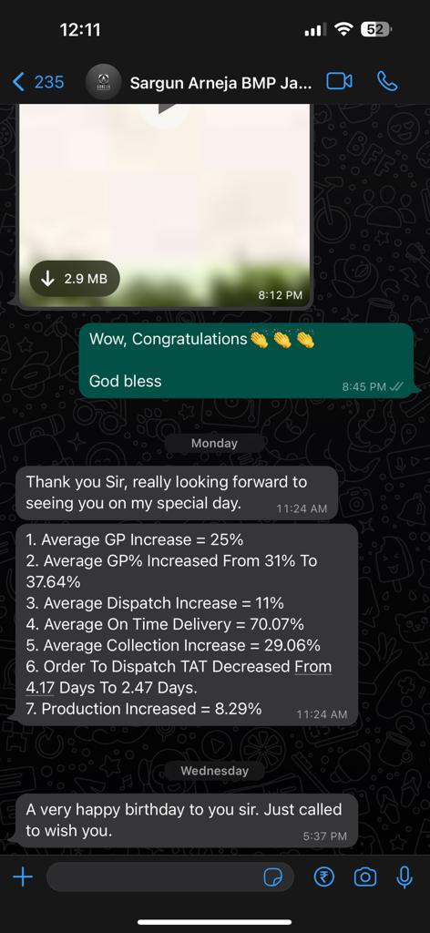 completed the Business Mastery Program in the year 2016. Now I need to go to the office only once a week.  Today I have defined MIS for each and every employee and this helps to track down gaps between planned and achieved. Due to the shift in systems and its applicability our ranking in DelhiNCR directly shot to No.1 from being on No.7. Retailers always face a high attrition rate but after understanding the science of doing business I controlled my high attrition rate. Earlier on an average I had to recruit every 3-4 months but now 90% of my staff is more than a year old in my organisation. My service workshops also became a major revenue generation point and from 1000-1200 footfalls to 2500 footfalls. I also doubled my growth in sales, earlier my bookings were 200-250 bookings per month and after 6 months of completion we are booking 500 units per month. Our on time delivery is 90%, earlier it used 40-50 %. My customer complaints have also decreased drastically, to be precise maybe one complaint in 2-3 months. We have taken some major measures towards customer satisfaction and it has helped us to increase our revenue by 5 lakhs.
