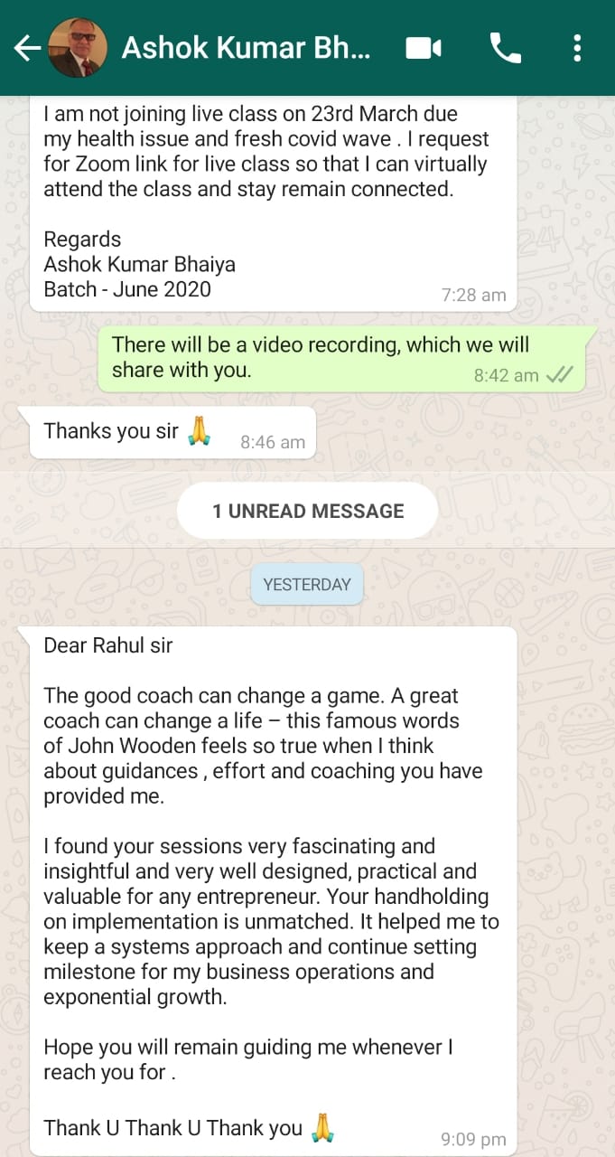 Sir, this workshop would be attended only by business owners from different verticals. Sizes of these businesses vary from medium to large turnovers. Since there would be people from different kinds of businesses how will I relate to it because my challenges are different? Sir for a moment I ask you to keep your product or service aside, the challenges that you face in running a business are all the same across the board. You are dealing with quality-related issues, deliveries don’t happen on time, payments don’t come in on time, employees don’t perform according to your expectations etc. We have been doing these workshops for about 15 years now and each time we have got very good feedback and Mr. Jain is able to address the issues and challenges during the workshop…….you can ask your questions also because it will be an interactive session, and just in case your challenges don’t get addressed in the session you can always take it up during your one to one interaction with Mr. Jain after the workshop. He always meets participants after the workshop for a Q&A where people come up with their issues and get solutions for the same this is a part of the workshop and there is no charge for this.